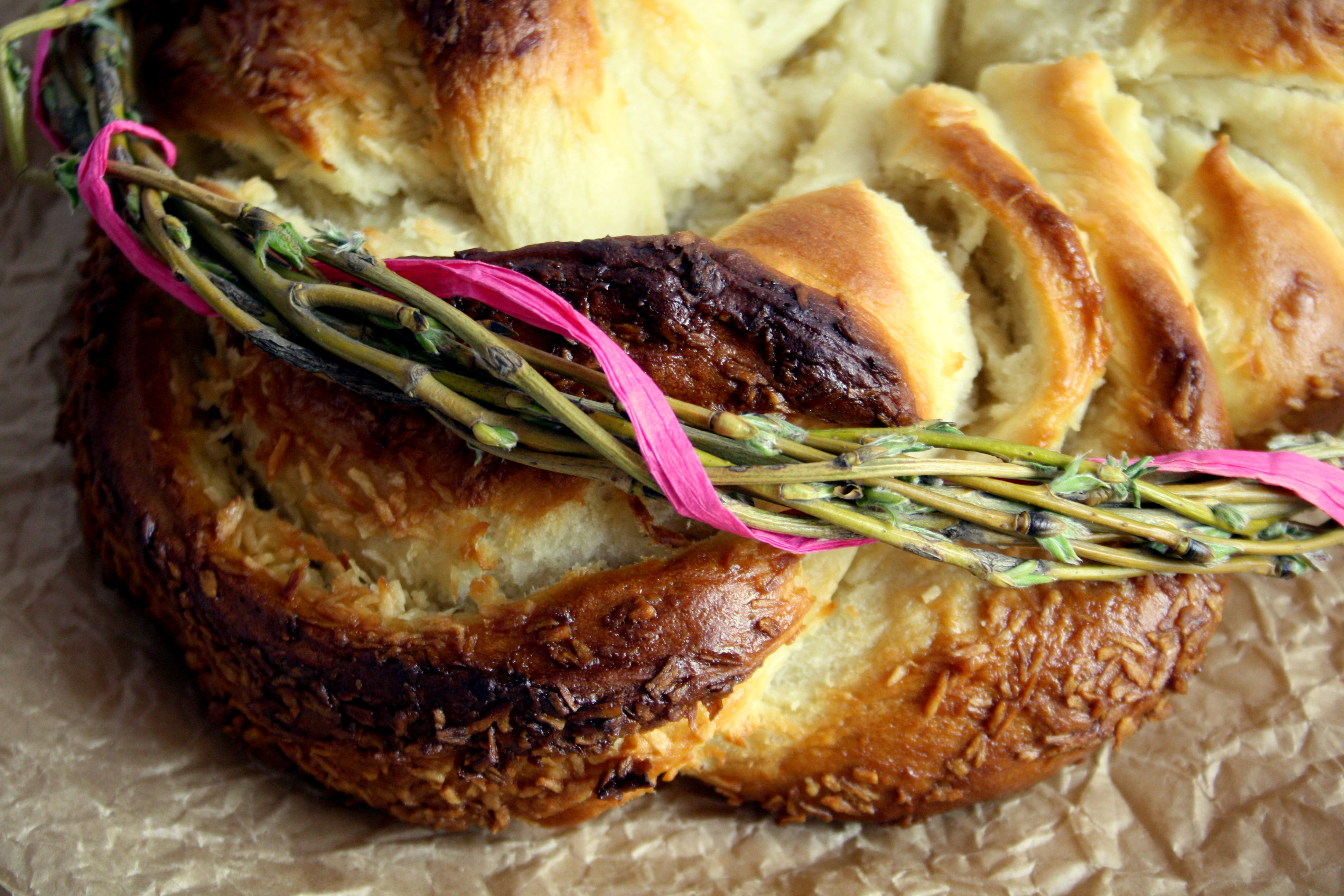 Następnie wyrabiamy ciasto z odrobiną mąki, aby się nie kleiło. Rozwałkowujemy, tak aby wyszedł nam możliwie równy prostokąt (40 cm x30 cm) . Smarujemy go kokosowym farszem. Ciasto zwijamy w rulon i przekrajmy go ostrym nożem wzdłuż. Splatamy w warkocz, a następnie z warkocza formujemy wieniec. Układamy na silikonowej macie lub formie wyłożonej papierem do pieczenia. Pieczemy w 180 st.C przez około 10-15 minut.