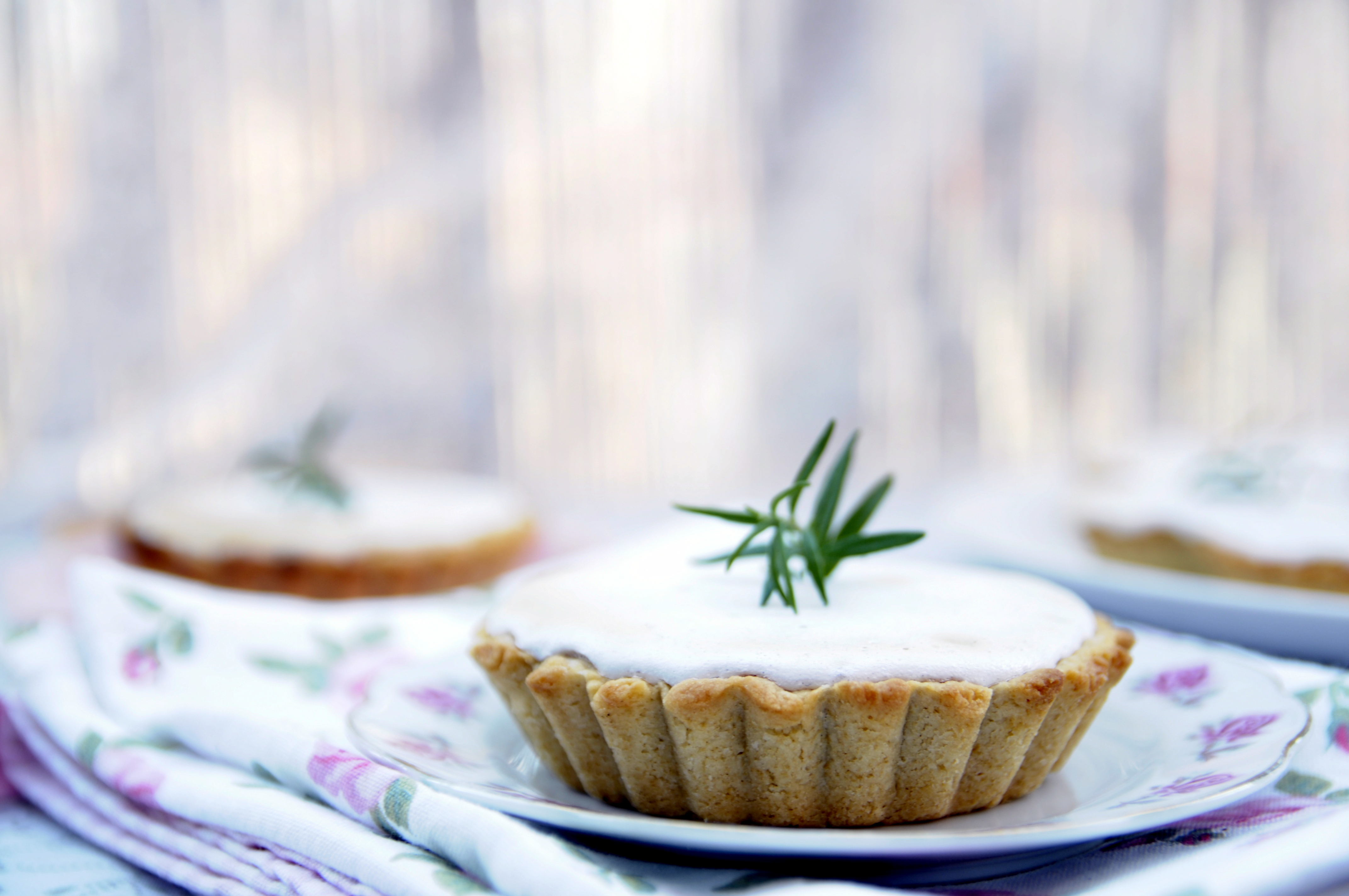 Wegańskie tarteletki z rabarbarem i rozmarynem pod bezową pianką.