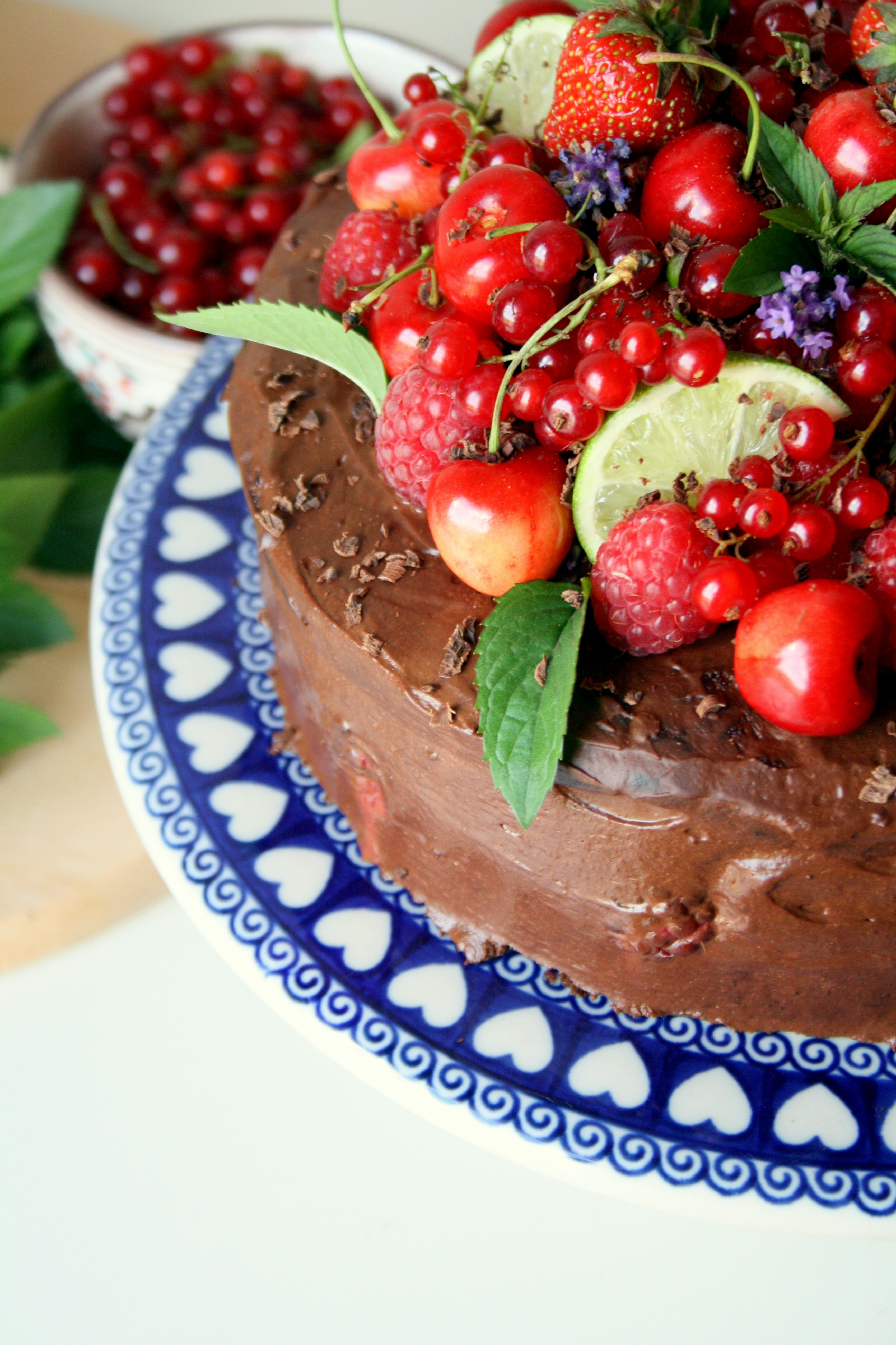 Podwójnie czekoladowy tort z letnimi owocami. Wegański