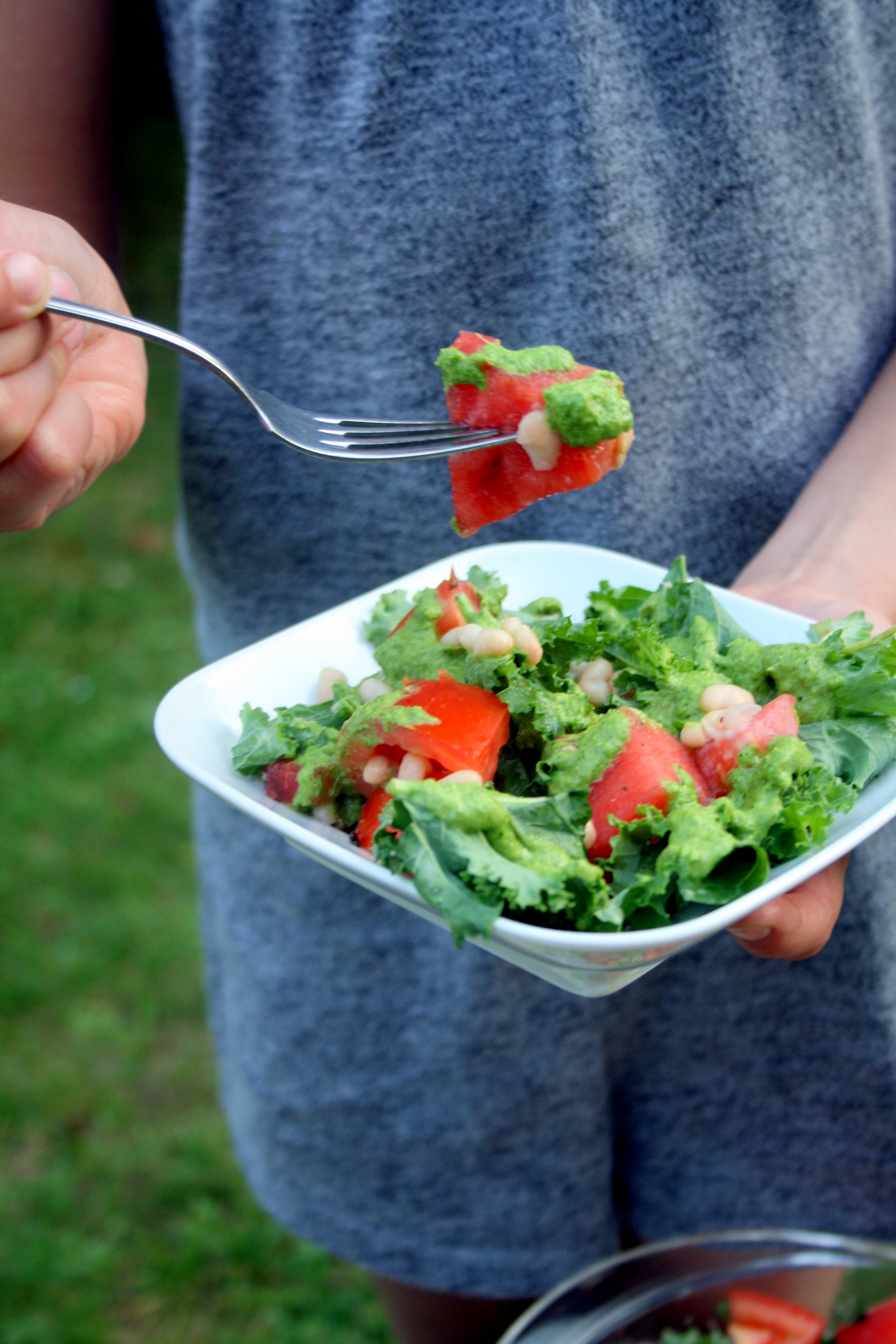 Letnia sałatka z jarmużem i arbuzem z pietruszkowo-miętową salsą verde.