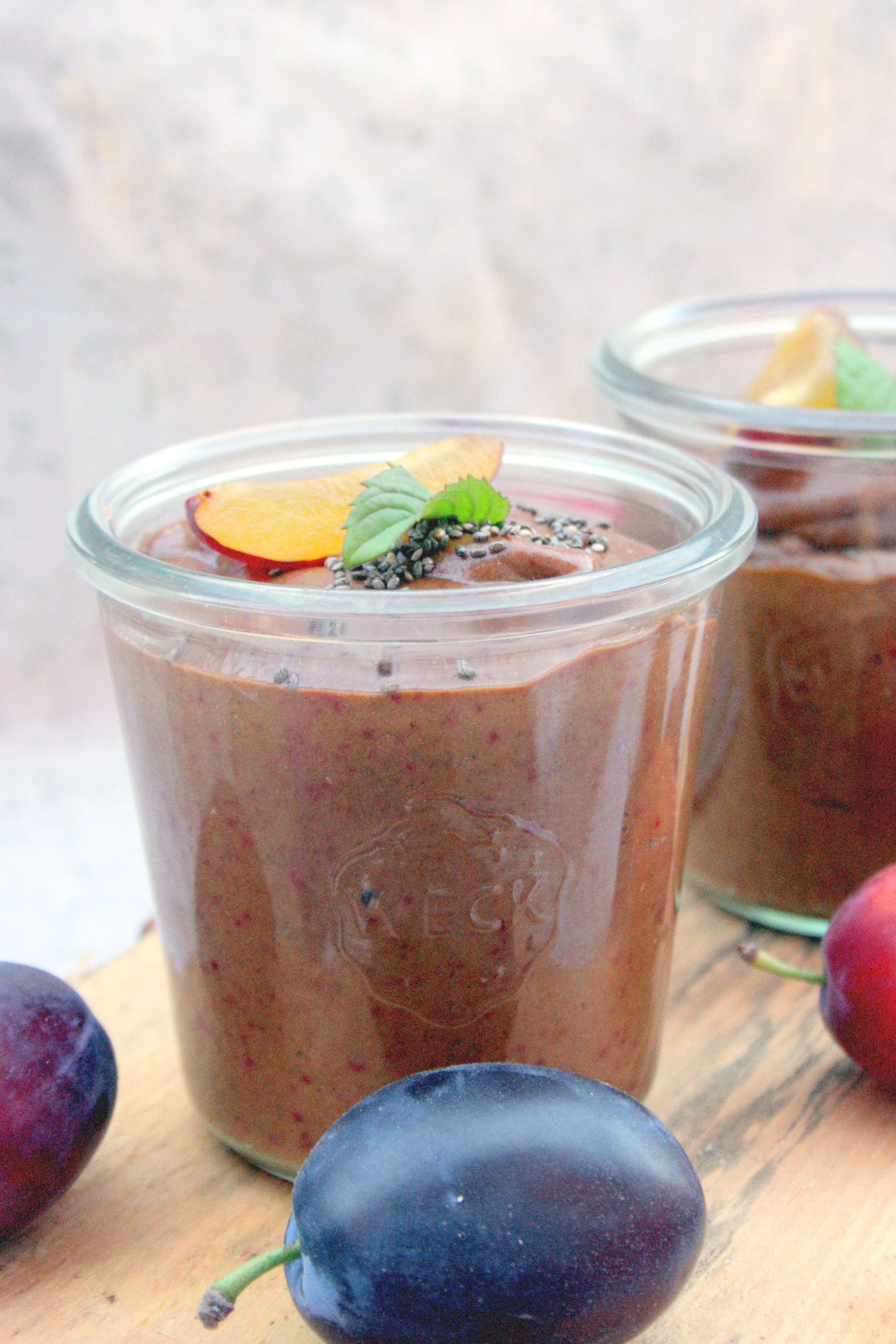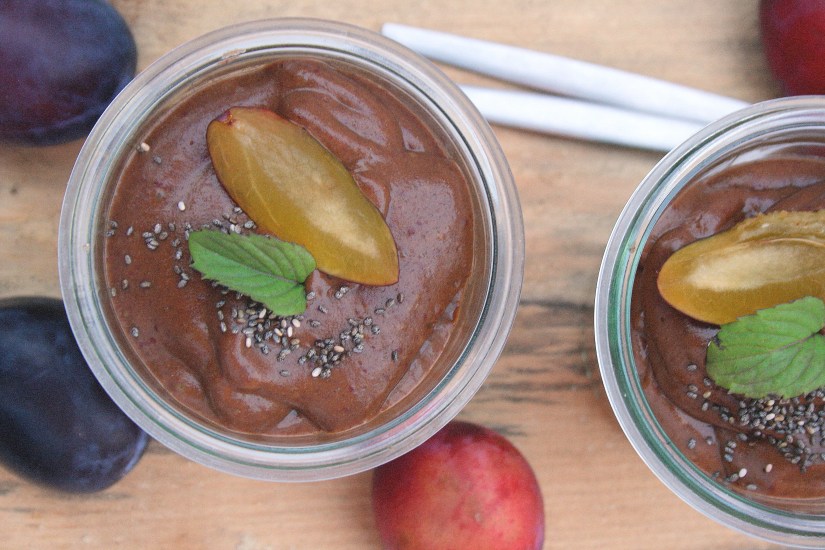 Przypomniał mi się truskawkowy mus z nasionami chia i daktylami, którym zajadałam się wczesnym latem. Z owoców, które są wciąż na topie, są stosunkowo niedrogie i smaczne przyszły mi do głowy śliwki. Nie spodziewałam się jednak, że będzie wyglądał tak… czekoladowo. Nawet mi przez moment przyszło do głowy, aby podkręcić go dodatkowo karobem lub kakao, ale potem pomyślałam, że sezon na śliwki w końcu się skończy i może warto nacieszyć się smakiem owoców samych w sobie.