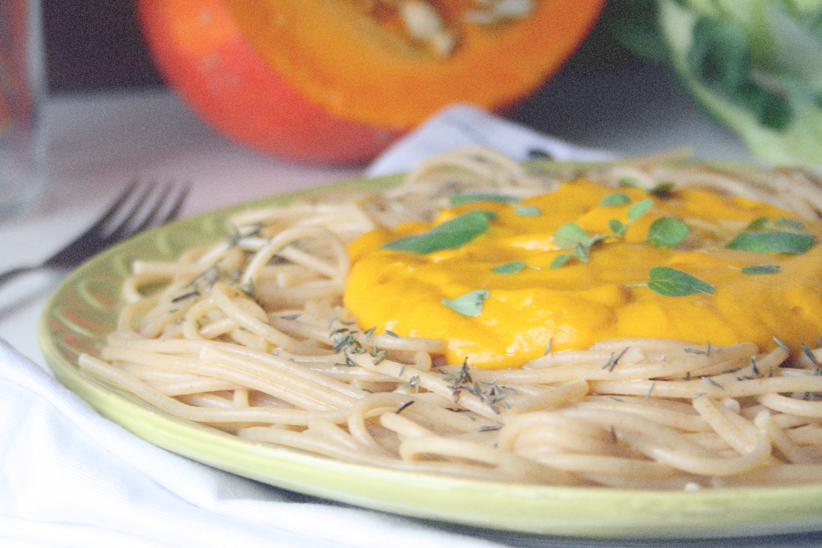 Na blogu pojawił się już przepis na wegańskie alfredo w najprostszej, kalafiorowej wersji. Latem zapraszałam do wypróbowania tego sosu z dodatkiem pomidorów, a niedawno przyszedł mi do głowy jeszcze jeden pomysł – na połączenie dyni i kalafiora. Sos nie tylko smakiem, a również kolorem bardzo przypomina sos serowy i świetnie sprawdza się podany z makaronem. Oczywiście nie widzę przeszkód, aby znalazł inne zastosowanie. Można dodać go do warzywno-makaronowych zapiekanek albo podać z pieczonymi warzywami. Skorzystajcie z receptury dopóki sezon na dynię w pełni.
