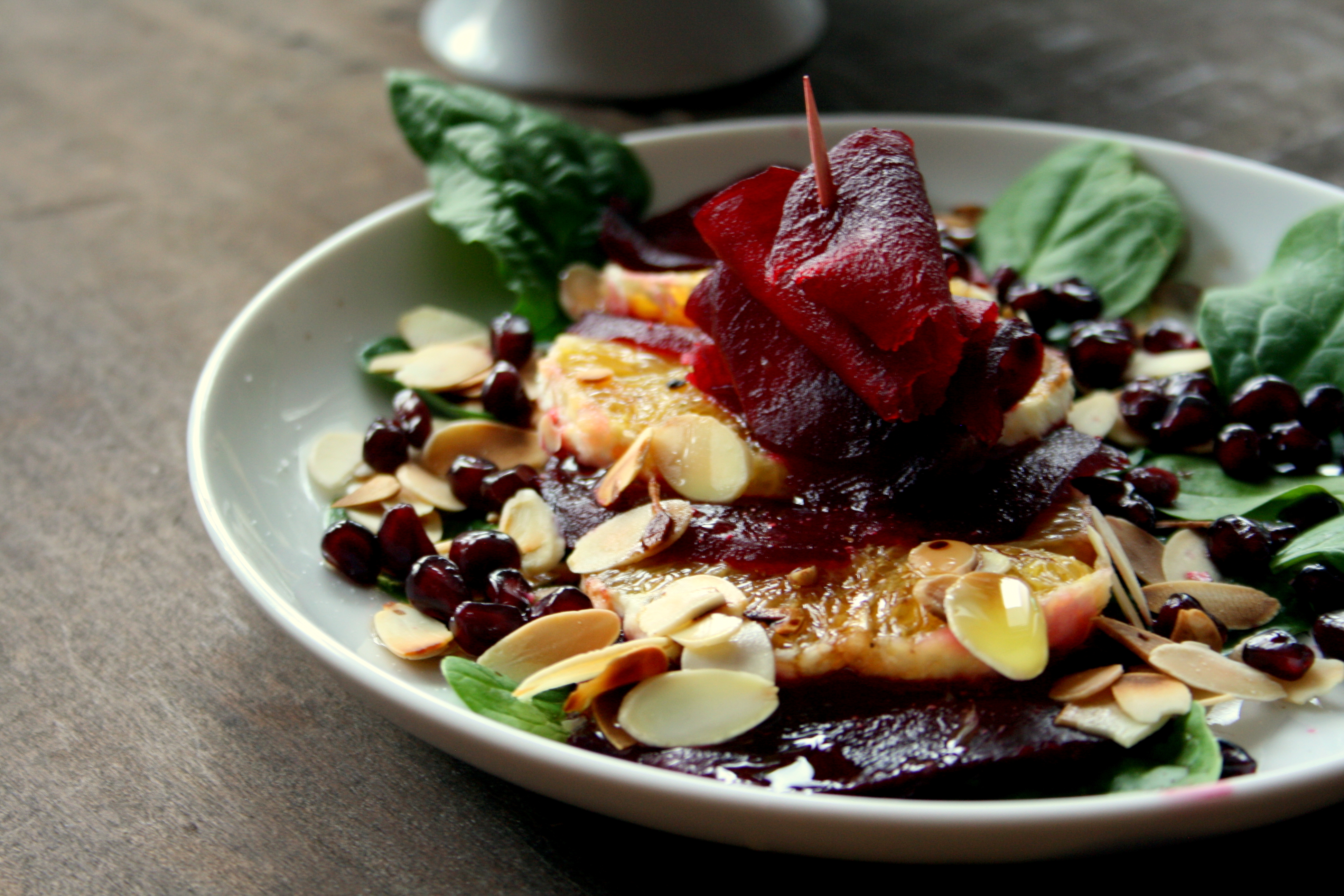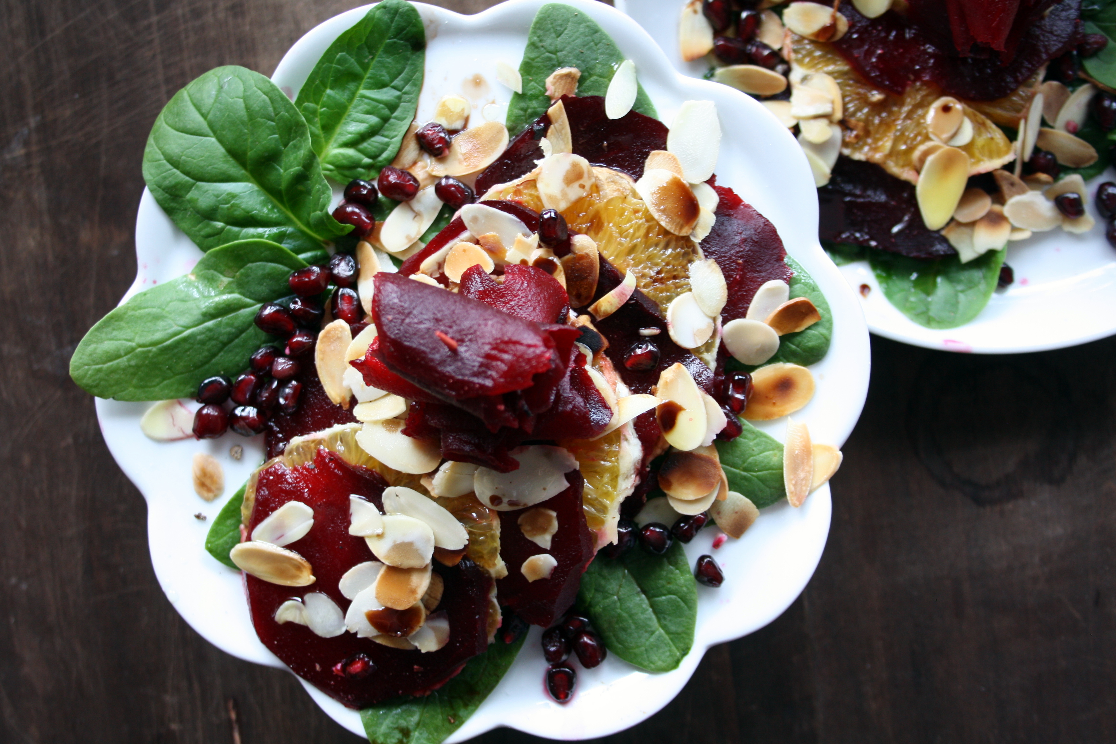 Pomarańcze obieramy i kroimy w cienkie, równe plasterki. Wystudzone buraczki obieramy ze skórki i kroimy w cienkie plastry. Na talerzykach rozsypujmy równomiernie umyte i wysuszone liście szpinaku, przekładamy na zmianę pomarańcze i buraki. W proporcji – 4 plastry buraków na trzy plastry pomarańczy. Skrapiamy odrobiną oliwy z oliwek i octu balsamicznego. Posypujemy świeżo mielonym pieprzem i szczyptą soli.