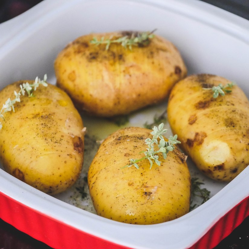 Ziemniaki dokładnie wyszorować. Ostrym nożem, na całej długości ziemniaków, zrobić co 2 mm głębokie nacięcia. Do naczynia żaroodpornego wlać 1 łyżkę oliwy i włożyć ziemniaki (nacięciami do góry). Każdego ziemniaka polać łyżeczką oliwy, posolić, doprawić pieprzem. Rozsypać gałązki świeżego tymianku. Wstawić do rozgrzanego piekarnika i piec 30 minut pod przykryciem. Nie wyłączając piekarnika ostrożnie wysunąć i otworzyć naczynie żaroodporne. Posmarować ziemniaki odrobiną oliwy, przewrócić je nacięciem do dna foremki i piec dalej kolejne 40-50 minut pod przykryciem. Sprawdzić patykiem do szaszłyków czy są miękkie. Gotowe wyciągnąć z pieca.