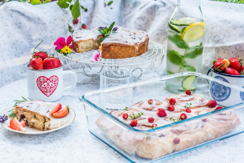 Drożdżówki niby nie powinny kojarzyć nam się z wakacjami, a raczej lody i owocowe desery. Mi jednak drożdżowe wypieki, jak na ironię kojarzą się z latem najbardziej, bo właśnie w tym czasie pieczemy ciasta w owocami. Mam takie wspomnienie z moich nastoletnich czasów, kiedy w wakacyjne wieczory piekłam jak szalona rogaliki, zawijańce, krantze, drożdżówki lub po prostu placek drożdżowy. Czasami znikał już podczas śniadania, czasami zabieraliśmy go ze sobą na plażę. Właśnie wyjazdy nad morze czy jezioro kojarzą mi się z drożdżowymi wypiekami szczególnie, bo po drodze kupowaliśmy jagodzianki czy warkocze z makiem… Oczywiście za nami zlatywały się osy, ręce lepiły się od cukru i lukru, więc była to mało praktyczna przekąska, ale co zrobić? Moje dzieciństwo przypadało na okres cudownych lat 90-tych. Często ciastka oblepiały się piachem, który potem właził między zęby, ale w wakacje wszystko to, co normalnie wyprowadziłoby człowieka z równowagi było akceptowalne. Takie ich prawo.