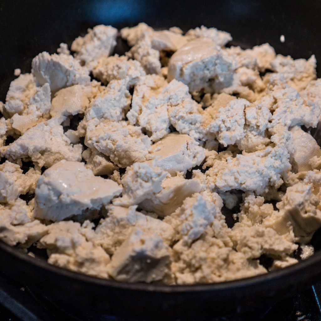 Na patelni rozgrzewamy olej. Tofu kruszymy raczej na większe niż mniejsze kawałki. Na pewno nie robimy tego widelcem, praską, tłuczkiem czy innym urządzeniem mającym rozdrobnić tofu na malutkie kawałeczki. Najlepiej spójrzcie na zdjęcie i zobaczcie o co chodzi: