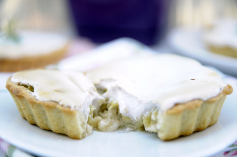 Wegańskie tarteletki z rabarbarem i rozmarynem pod bezową pianką
