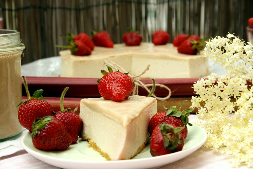 Tofurnik na zimno na kukurydzianym spodzie z rabarbarowym kremem z nerkowców