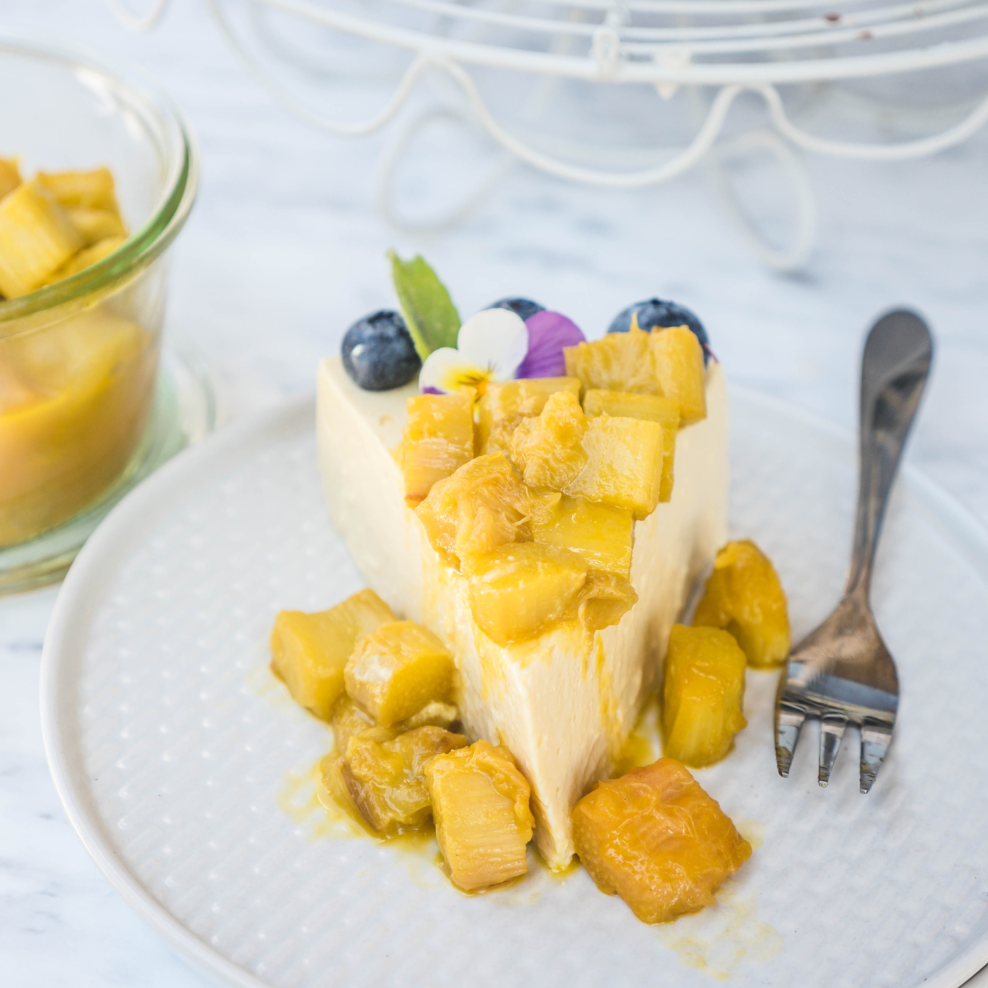 Tofurnik na zimno z karmelizowanym rabarbarem