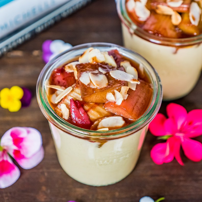 Budyń jaglany z tofu i pieczonym rabarbarem