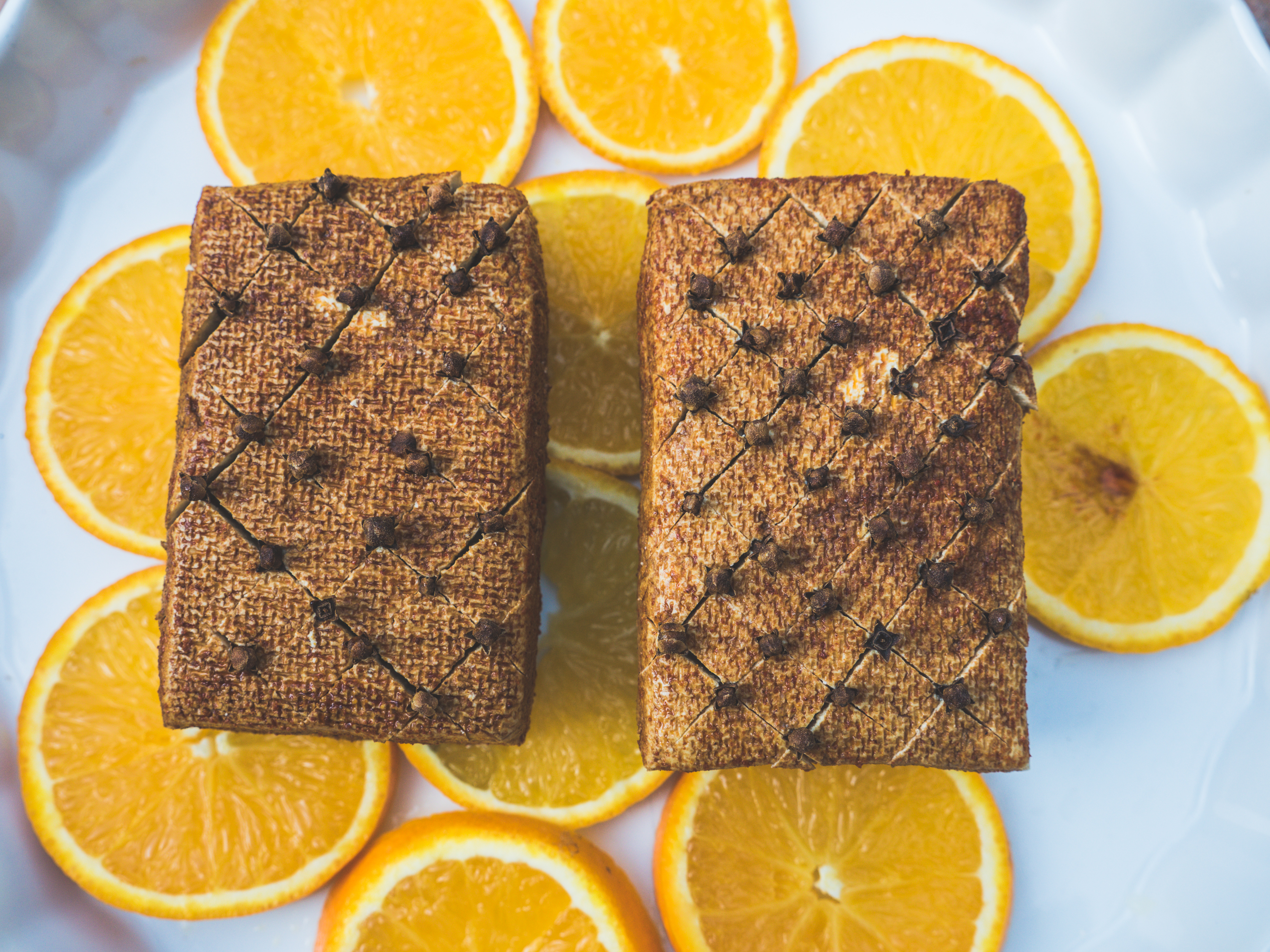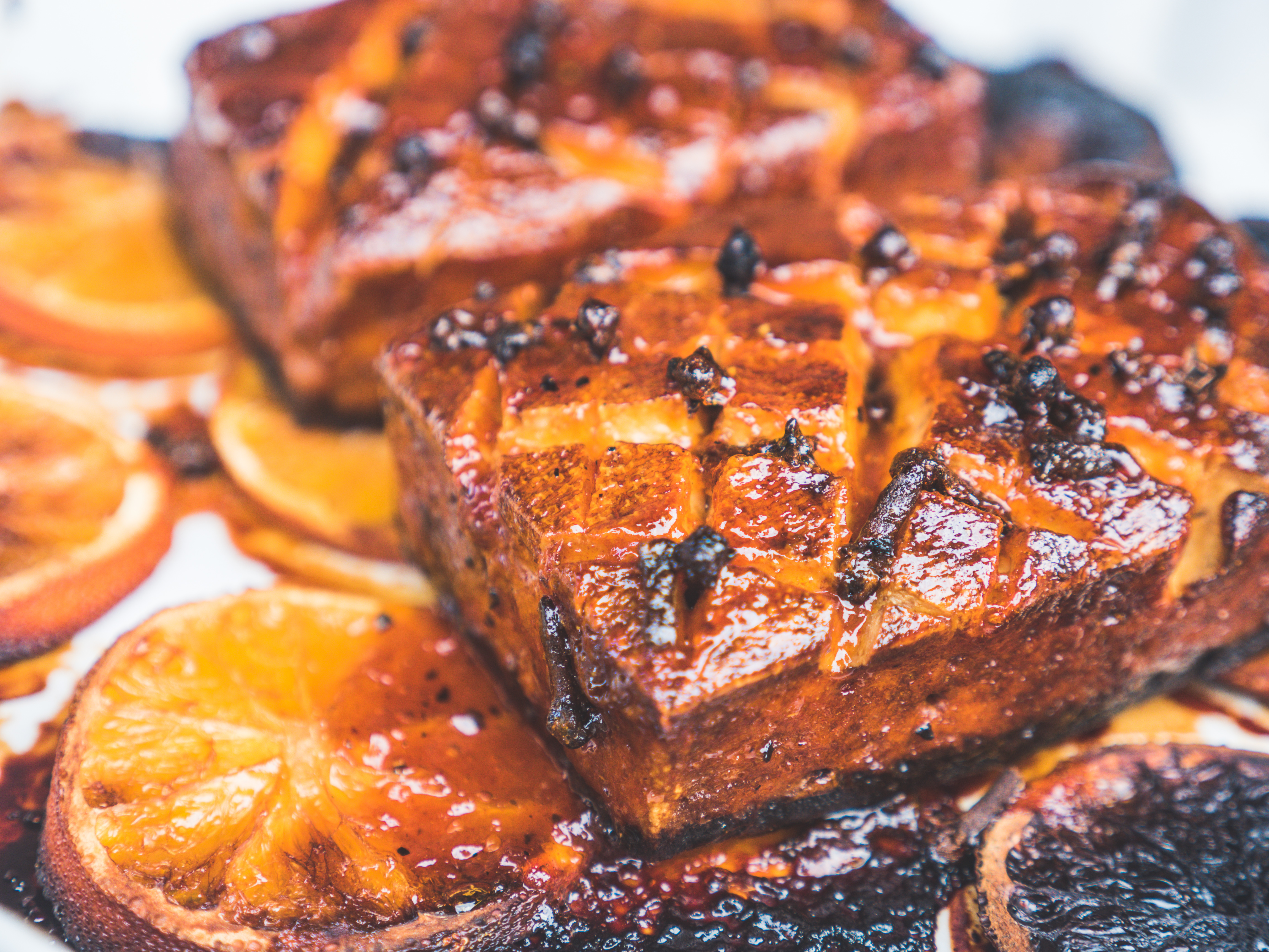 Do przygotowywania tego tofu glazurowanego w pomarańczach przymierzałam się do dawna, bo odkąd zobaczyłam je w książce „Isa does it” ładnych kilka lat temu. TO danie wracało do mnie w snach. W końcu w zeszłoroczne Święta upiekłam je na obiad i zdecydowanie było to hit. Oczywiście wiedziałam, że muszę wrzuć przepis tutaj. Nie trzymałam się do końca oryginału, bo zamiast jednego dużego tofu użyłam dwóch mniejszych kostek, tych standardowych 180 g, które są obecnie dostępne w każdym dyskoncie. Zamiast whiskey użyłam octu balsamicznego, a dżem morelowy zastąpiłam bardziej dostępnym brzoskwiniowym, najważniejsze, aby był gładki, a nie z kawałkami owoców. Co do ilości goździków to wszystko zależy jak natniecie tofu. Może być ich mniej lub więcej. Zależy od tego jak intensywny mam być smak. Ci, którzy chcą intensywniejszy, nacinają w drobniejsze romby i używają więcej goździków, Ci którzy chcą spróbować mniej intensywnego muszą naciąć większe romby i zużyć mniej przypraw. Ot, cała filozofia.