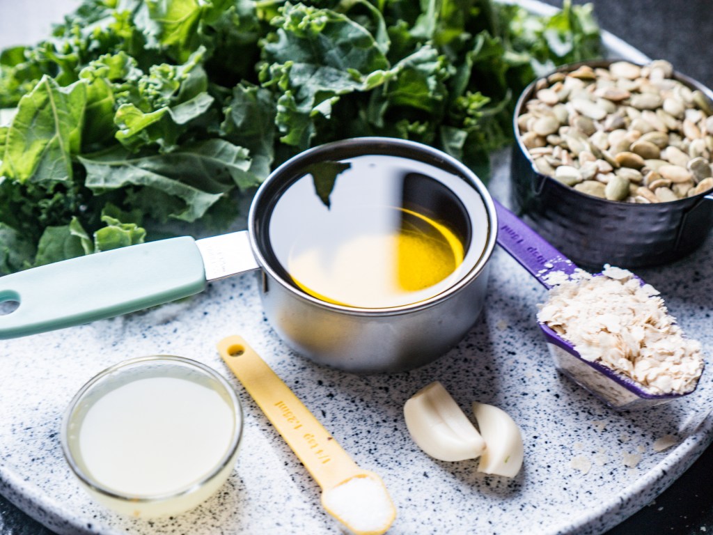 Wsypujemy jarmuż i wlewamy sok z cytryny. Przy włączonym robocie kuchennym, wlewamy oliwę z oliwek i miksujemy z pozostałymi składnikami. Opcjonalnie doprawiamy do smaku.