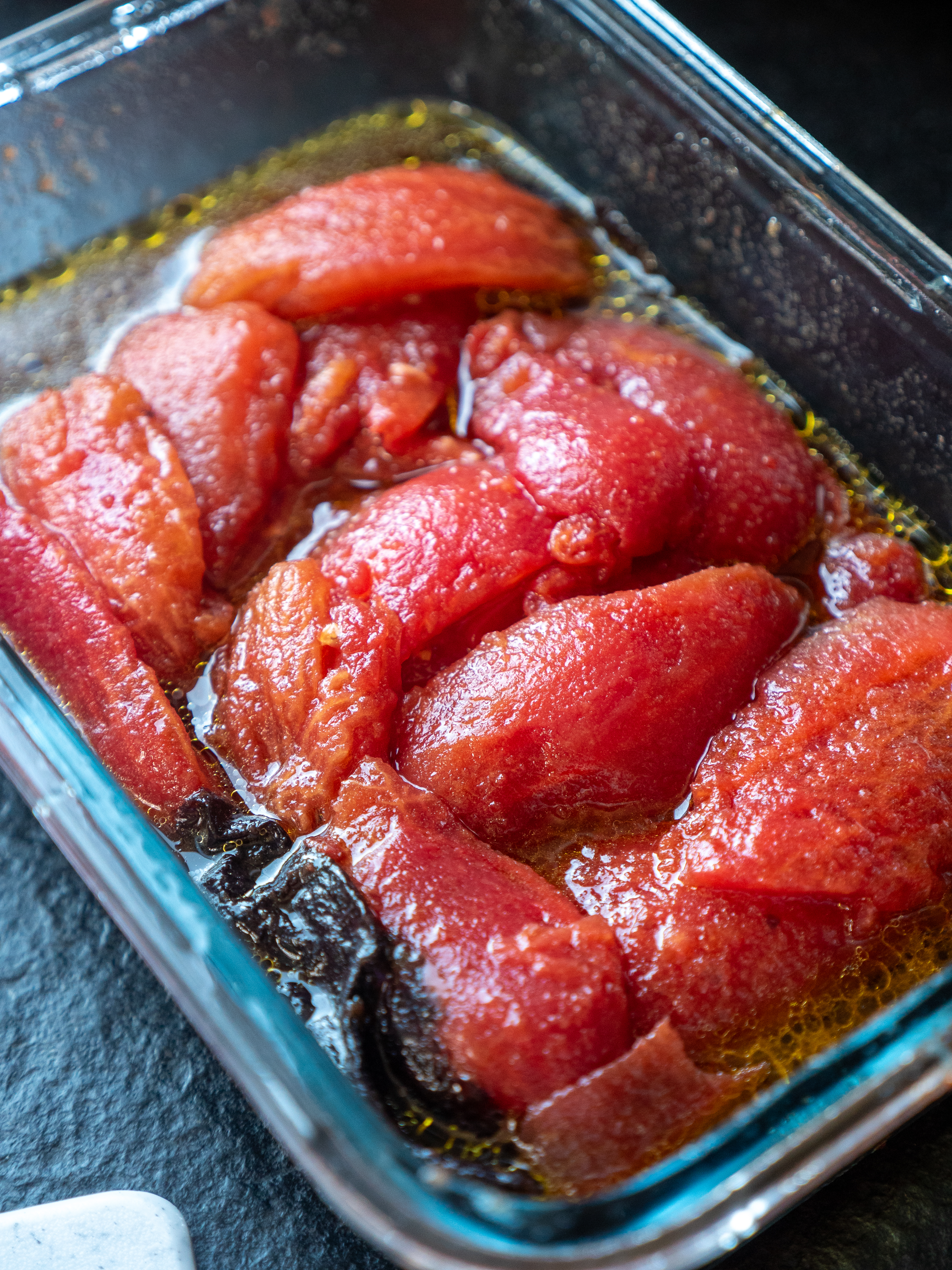 Obierz pomidory ze skórki. Przekrój je na pół, a następnie ostrożnie usuń nasiona. Naczynie, w którym będziesz marynować pomidory wyłóż arkuszem glonów nori. Następnie ułóż pomidory na arkuszu i skrop marynatą. Wymieszaj, aby upewnić się, że pomidory są równomiernie pokryte marynatą. Przykryj i wstaw do lodówki na co najmniej 30 minut. Przechowuj w szczelnym pudełku w lodówce do 4 dni.