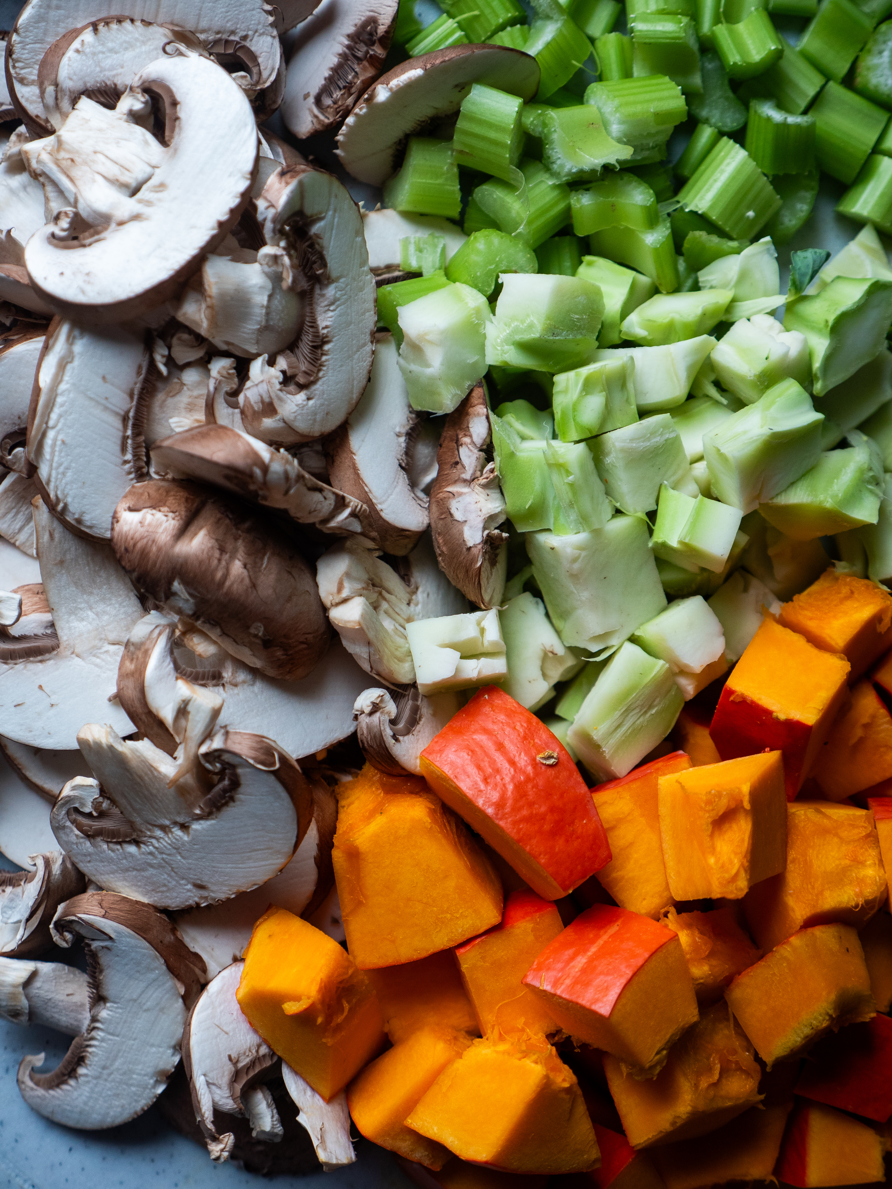 - około 0,5 kg dyni hokkaido, wydrążyć z pestek i pokroić w około 1,5 cm kostkę