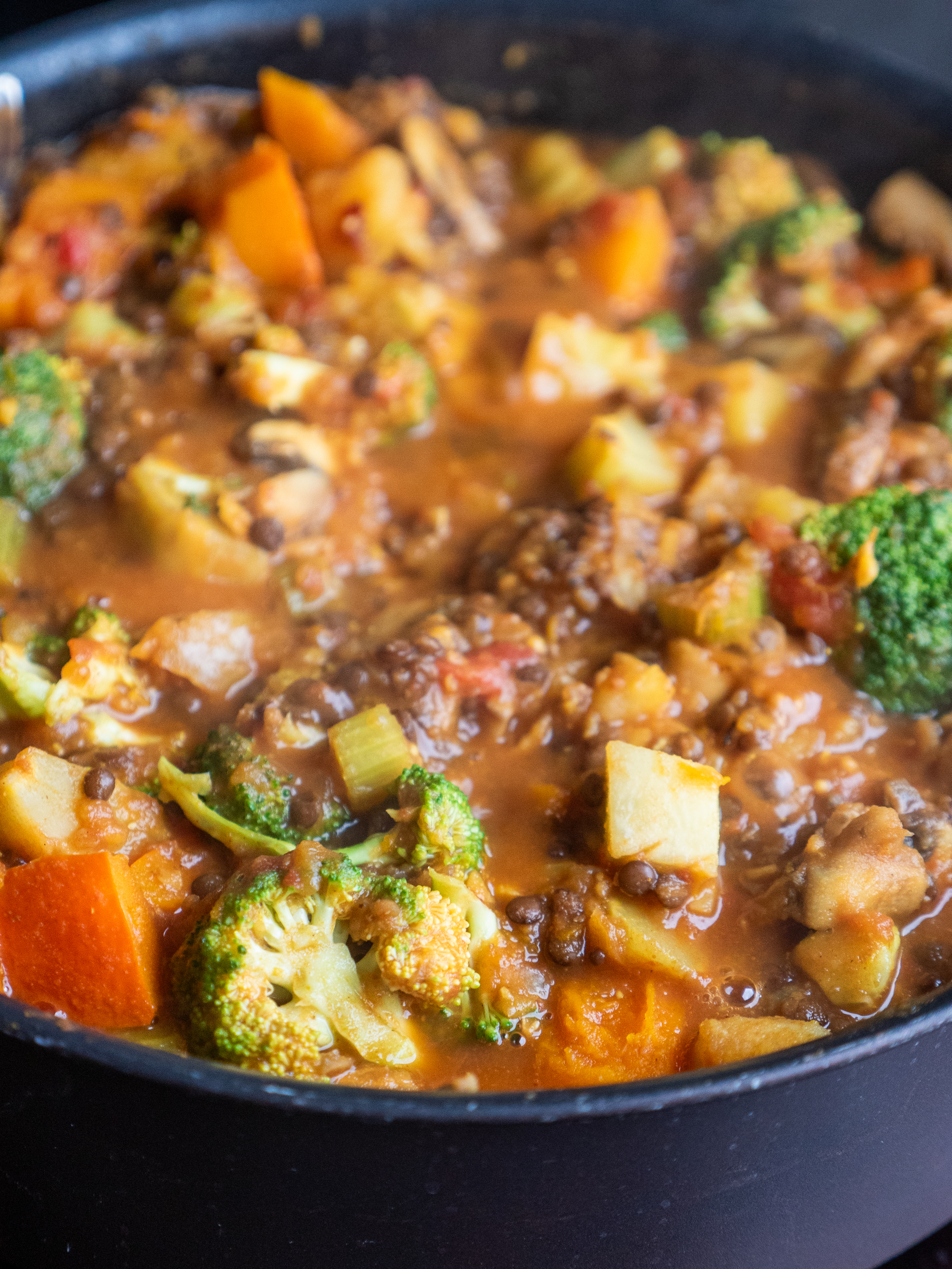 Dodaj przyprawy i sól. Wymieszaj. Dodaj ziemniaki i ponownie wymieszaj z cebulą i przyprawami. Wlej wodę lub bulion. Gotuj przez 10 minut. Następnie dodaj dynię, seler, pokrojoną łodygę brokuła, soczewicę( uprzednio ugotowaną), pieczarki oraz pokrojone pomidory z puszki wraz zalewą, przecier pomidorowy. Wymieszaj warzywa i gotuj kolejne 15-20 minut (dynia musi zmięknąć). Dodaj różyczki brokuła i gotuj 5 minut. Różyczki brokuła mogą pozostać al dente.