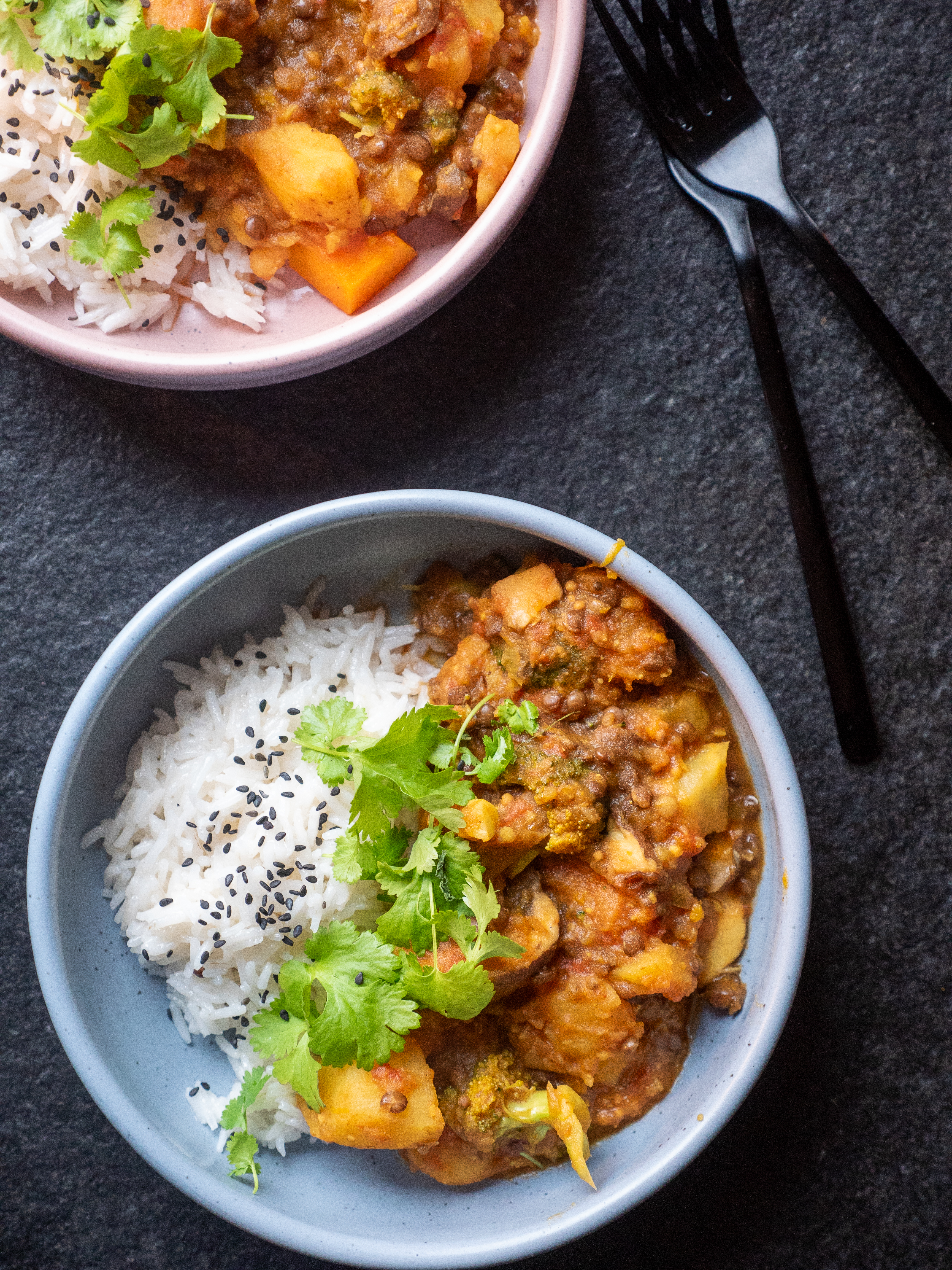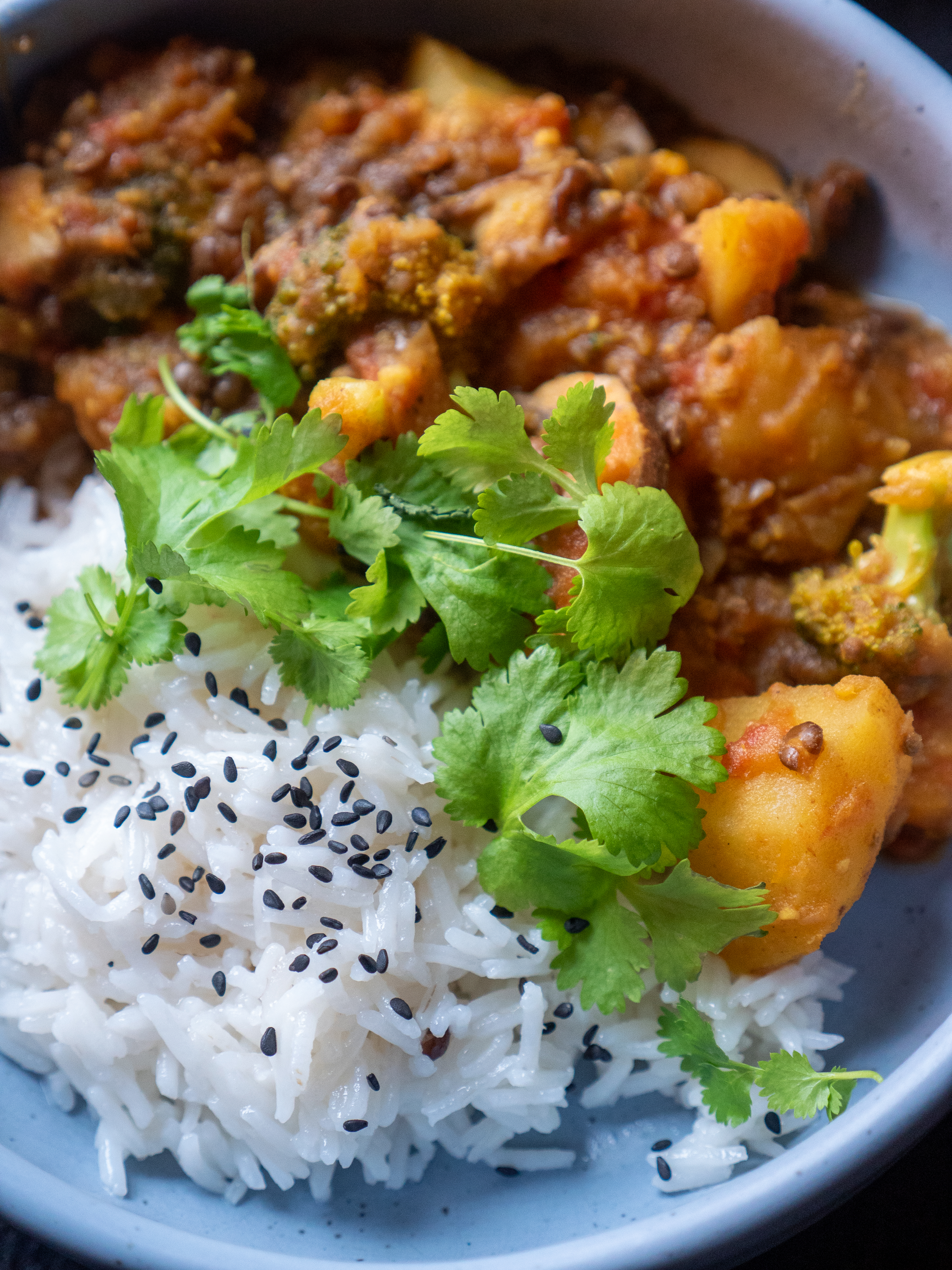 Tego typu jednogarnkowce były bardzo popularnymi daniami w mojej kuchni na początku mojego weganizmu. Łatwe w przygotowaniu, odżywcze i proste do odgrzania. Zanim zetknęłam się z tajskim curry na bazie pusty curry, to właśnie indyjskie odmiana tego dania była tą, którą lubiłam najbardziej. Oczywiście na ile to danie jest indyjskie można dyskutować ze względu na użycie przeze mnie cebuli i czosnku, ale myślę, że to nieistotny szczegół dla większości z nas i tym bardziej dla przepisu i smaku potrawy. Danie takie, jak to mają jedną szczególnie dużą zaletę: są bardzo łatwo modyfikowalne. Możesz do garnka wrzucić praktycznie każde warzywo i każde strączki, jakie przyjdą Ci do głowy lub zwyczajnie będziesz mieć pod ręką, a curry wyjdzie i będzie świetnie smakować. Możesz modyfikować ilość przypraw tak, aby te, które lubisz najbardziej były najlepiej wyczuwalne. Ja zawsze proponuję, aby za pierwszym razem ugotować mój przepis według podanej receptury, przerobić smaki przez własne kubki smakowe, a potem przy kolejnym razie modyfikować pod siebie. Oczywiście, jeżeli gotujesz od dawna to sama lektura receptury sprawi, że będziesz wiedzieć, co w niej zmienić tak, aby Tobie przypadała do gustu najbardziej. W każdym razie ja tam mam czytając cudze przepisy.