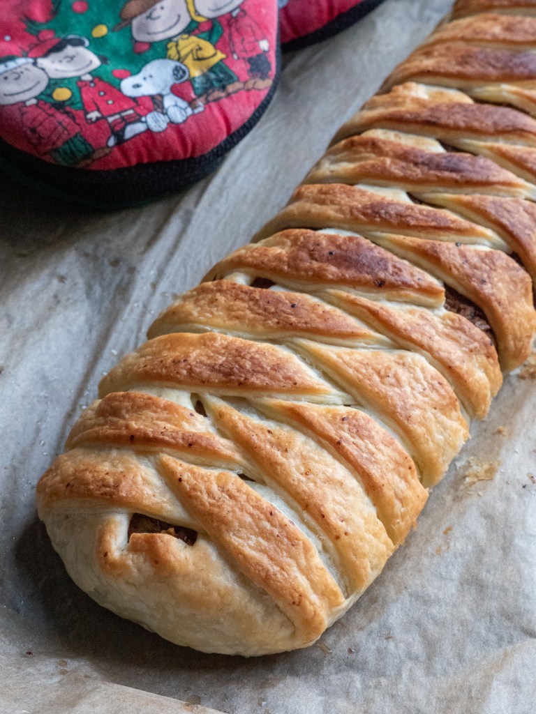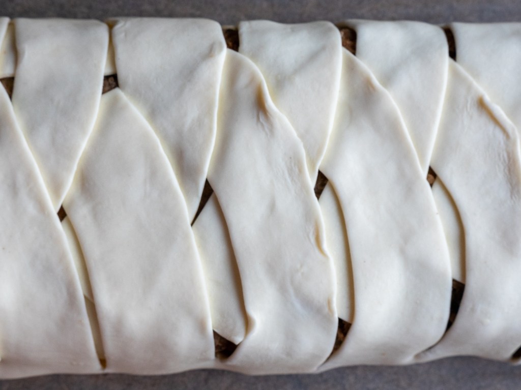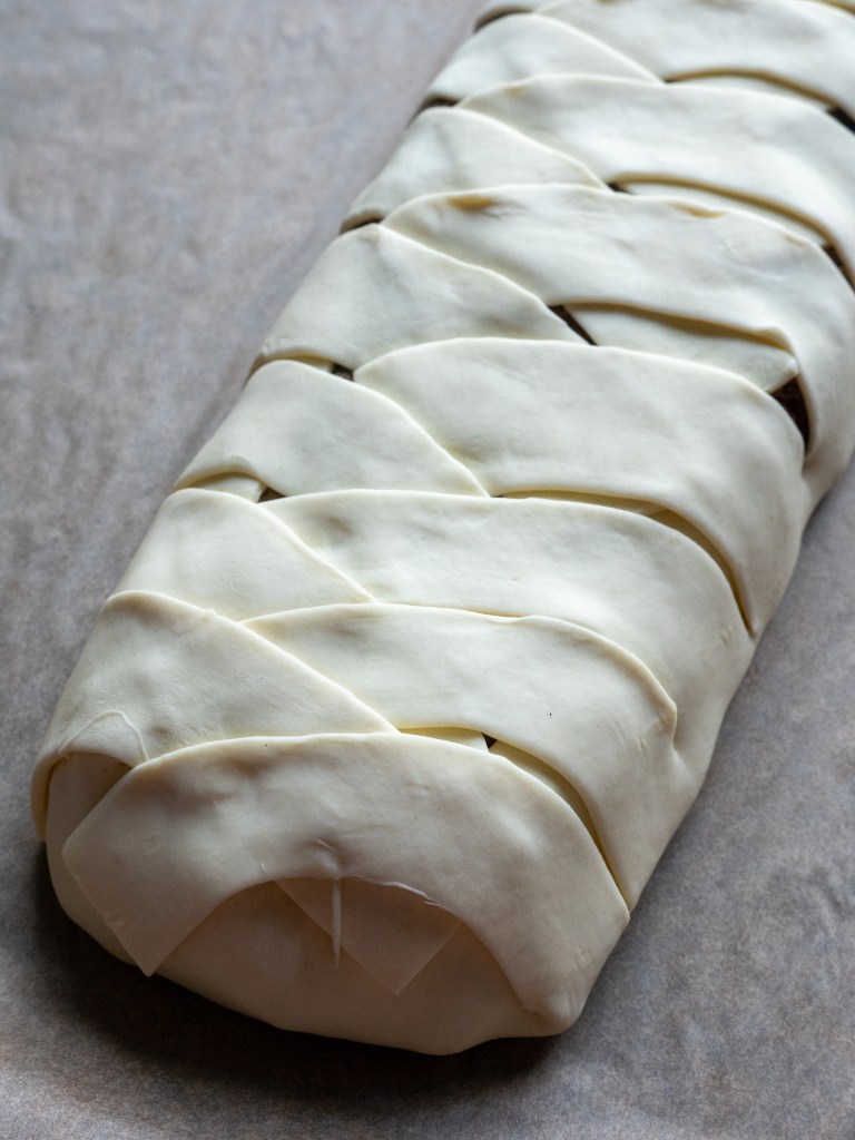 Na końcach postaw nieco więcej ciasta. Zamknij nimi końce bochenka, a następnie zaplataj paski na wierzchu nadzienia, naprzemiennie, tak, aby powstał warkocz jak na zdjęciu. Niewielkie szczeliny między warkoczami umożliwiają wydostawanie się pary i zapobiegają pękaniu Wellingtona w piekarniku.
