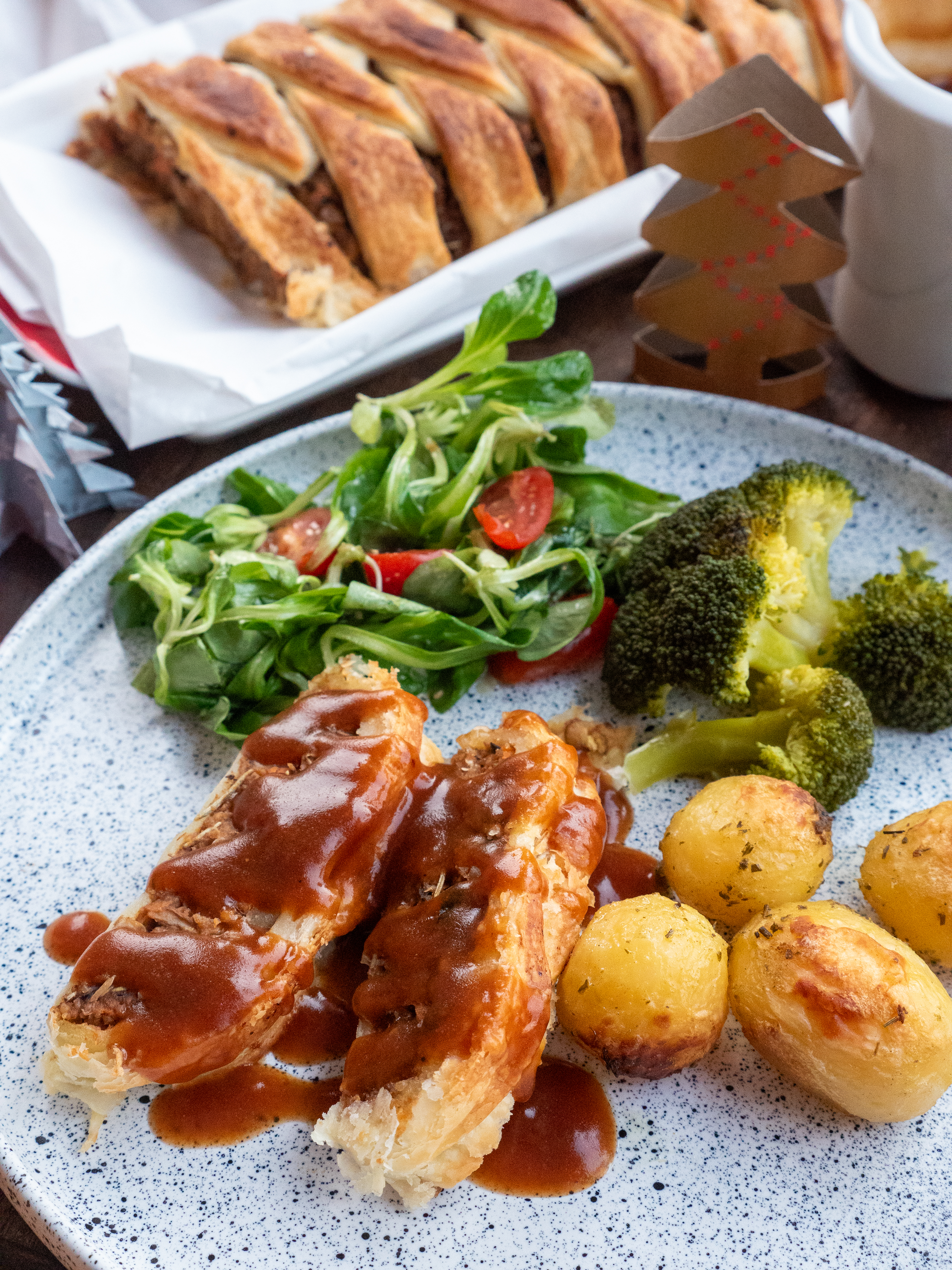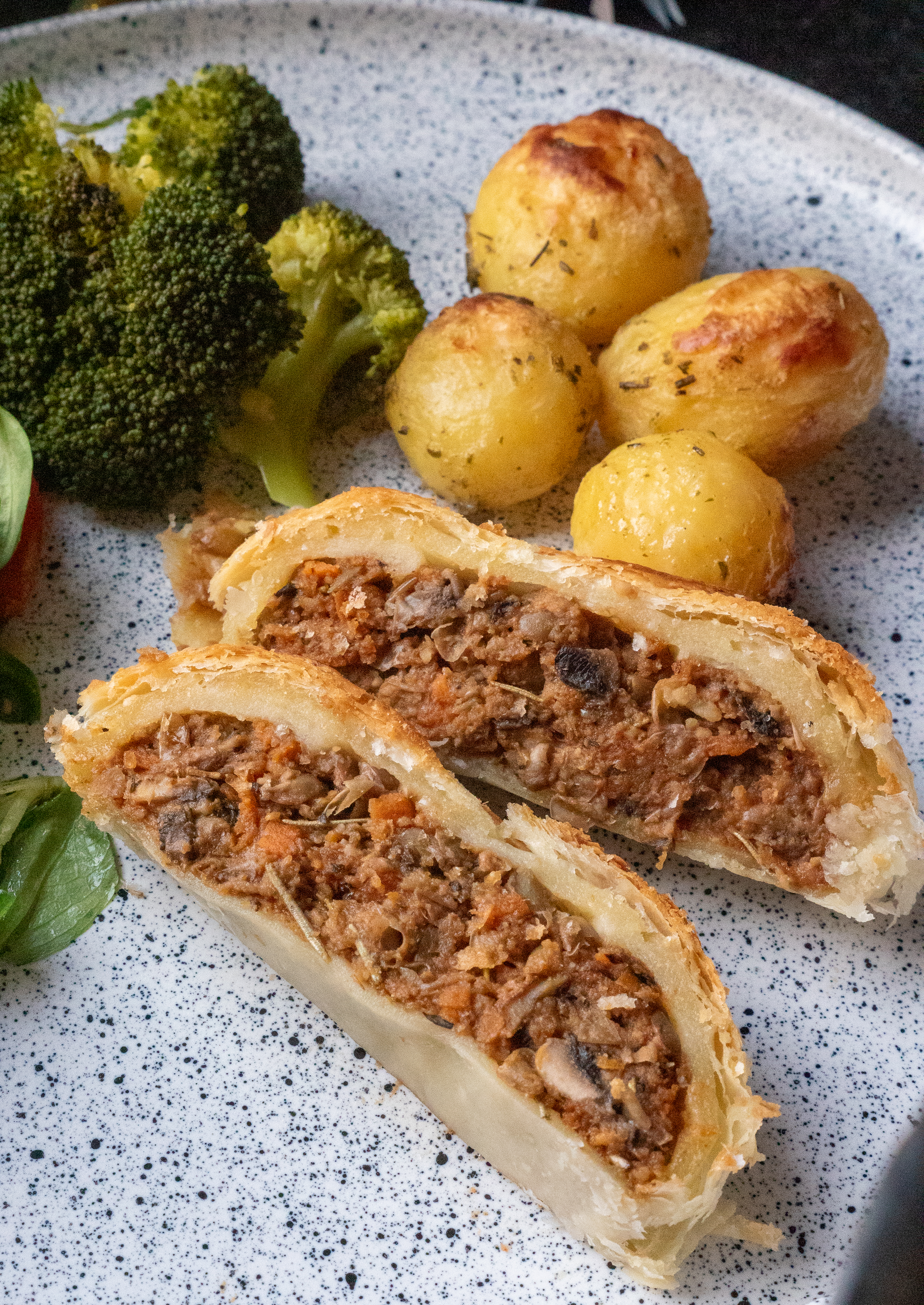 Wellington to bardzo popularne angielskie danie przyrządzane Święta Bożego Narodzenia. Choć wywodzi się z Wielkiej Brytanii, stało się popularne we wszystkich krajach anglosaskich, a z czasem na całym świecie. Po polsku słowo wellington oznacza kalosz, ale nazwa dania nie ma żadnego związku z obuwiem, ale pochodzi od nazwiska generała, zwycięscy bitwy pod Waterloo. W każdym razie tak podaje wikipedia. Tradycyjnie jest to danie na wskroś niewegańskie. Przyrządza się je bowiem z wołowiny. Niemniej bez trudu można je zweganizować i powiem Wam szczerze, że naprawdę warto. Wellington stał się już dawno jednym z moich ulubionych świątecznych potraw, nie tylko ze względu na fantastyczny smak i teksturę, która udaje się uzyskać dzięki starannie dobranym składnikom, ale dzięki temu, że jest odżywczy. Moja ulubiona wersja bazuje na zielonej soczewicy, pieczarkach i orzechach włoskich. Mam jednak taką teorię, że wszystko z zieloną soczewicą jest pyszne.