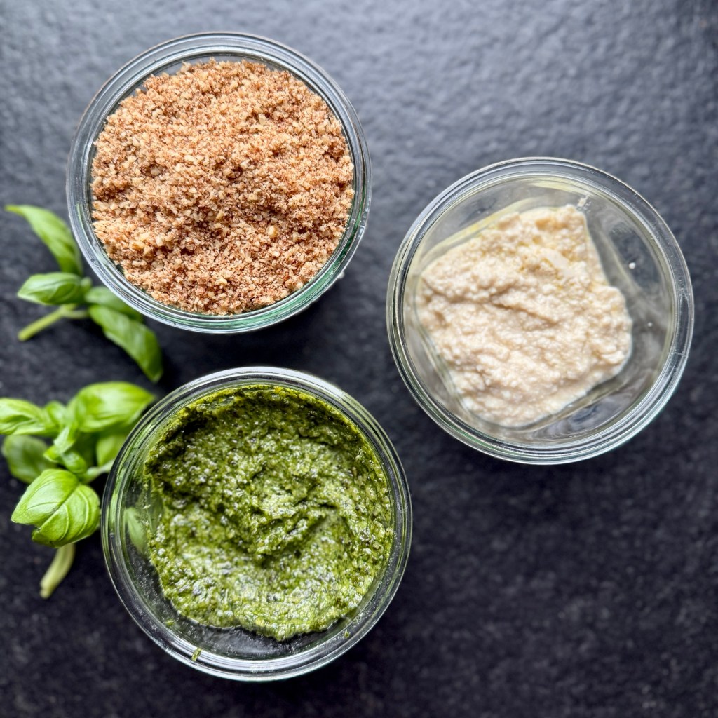Podczas gdy zupa się gotuje, przygotuj wegańska ricottę, pesto i wegański parmezan.