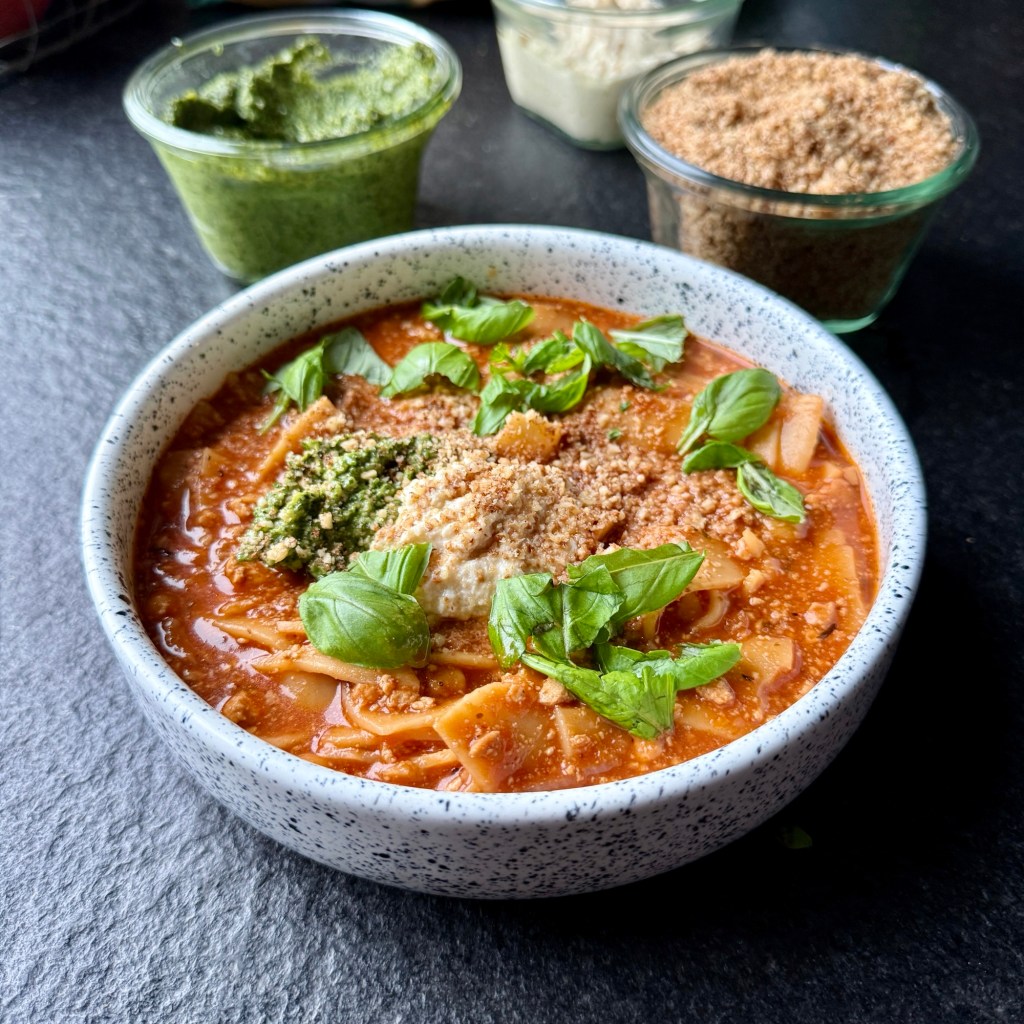 Ta zupa ma w sobie coś ze znanej i lubianej pomidorówki z makaronem, ale smak podkręcają zioła. Dodatek mielonego z tofu wzbogaca zupę w białko, a ciecierzyca w białko i błonnik. Z reguły dzielę sobie gotowanie dwa dani. Zaczynam od przygotowania mielonego z tofu – dzień wcześniej. Następnego dnia robię zupę i dodatki: pesto, ricottę z tofu i parm z orzechów i płatków drożdżowych.