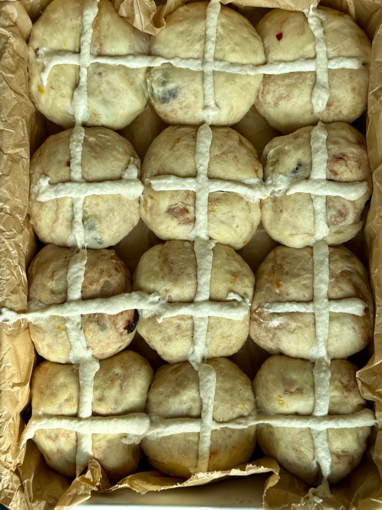 Przenieś masę do rękawa cukierniczego z małą dyszą (lub użyj plastikowego worka i odetnij róg). Nałóż krzyżyki na wierzch każdej bułeczki.