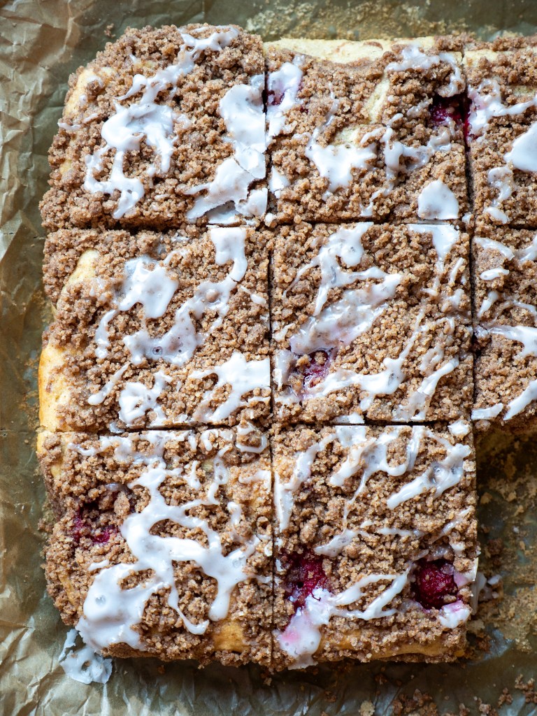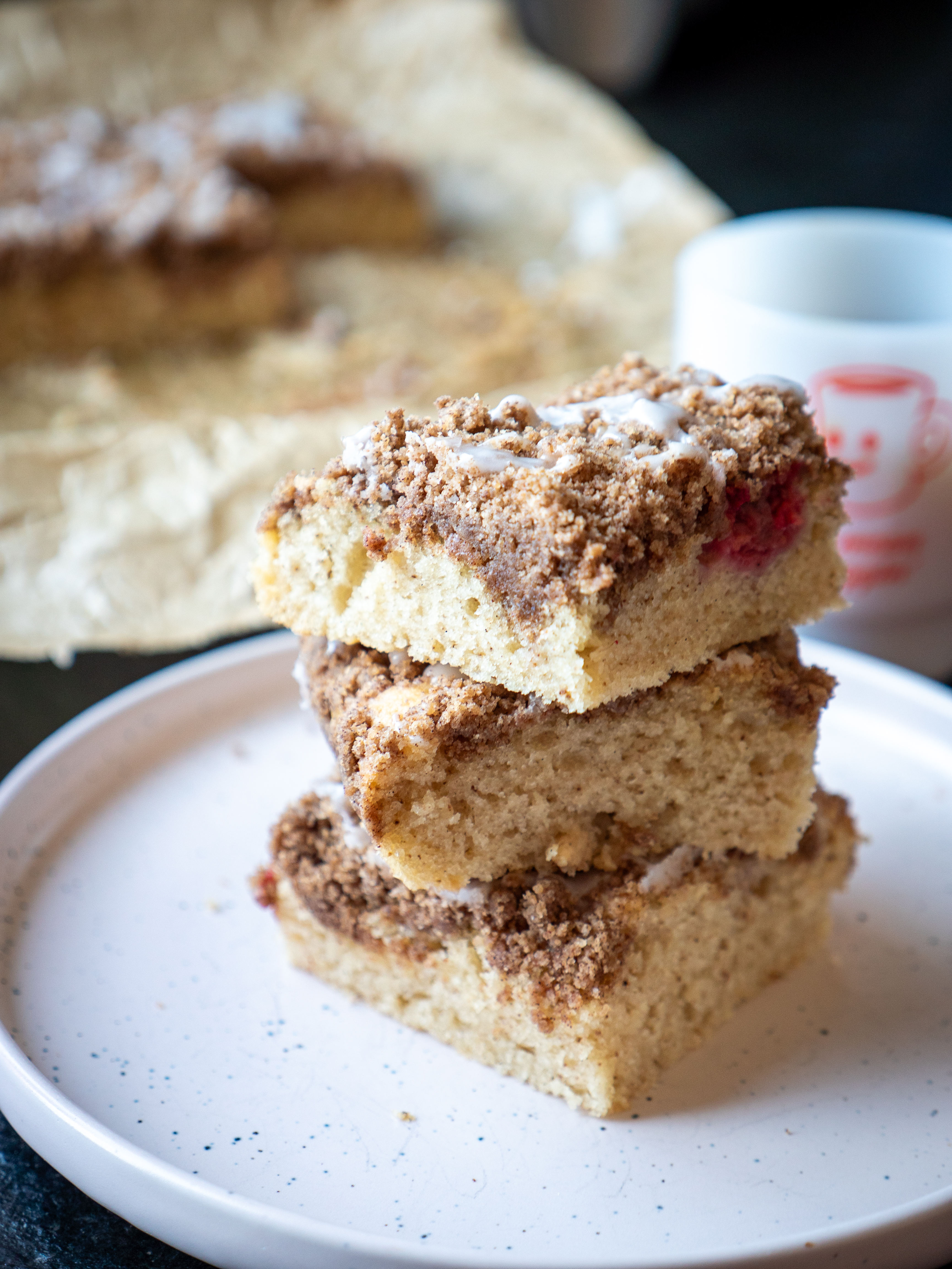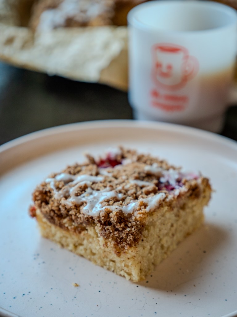 Coffee cake to biszkoptowy spód posypany cynamonową kruszonką. Opcjonalnie można dodać do środka owoce, zwłaszcza takie jak maliny, borówki, porzeczki. Jest miękkie i długo utrzymuje świeżość. Jak sama nazwa wskazuje, coffee cake to idealne ciasto do kawy. Na naszym wyjeździe do USA tak bardzo się sprawdzało, że po powrocie do niego wracamy