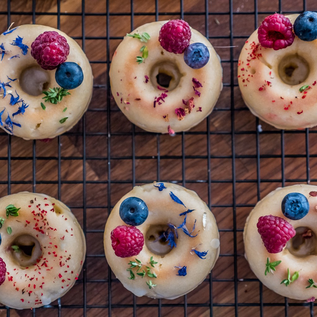 Gotowe donuty polej lukrem przygotowanym z 1/3 szklanki cukru pudru i dwóch-trzech łyżek soku z cytryny. Przybierz owocami i/lub pałatkami kwiatów jadalnych.
